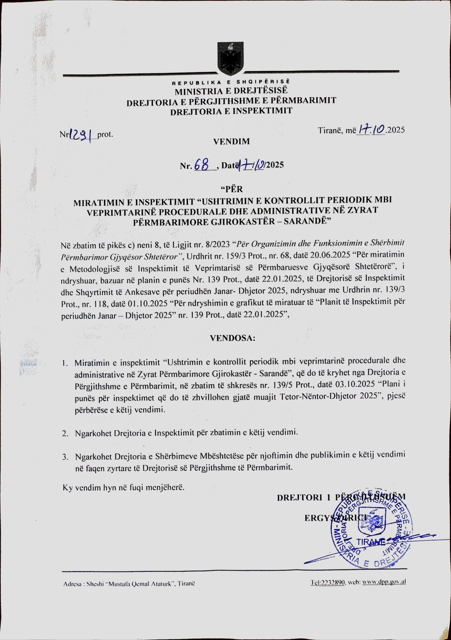 Vendim nr.68, Datë 17.10.2025 Për miratimin e Inspektimit ”Ushtrimin e kontr...