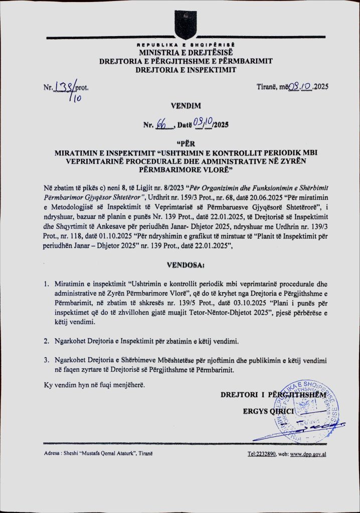 Vendim nr.66, Datë 09.10.2025 Për miratimin e Inspektimit ”Ushtrimin e kontrollit periodik mbi veprimtarinë proceduriale dhe administrative në Zyrën Përmbarimore Vlorë”